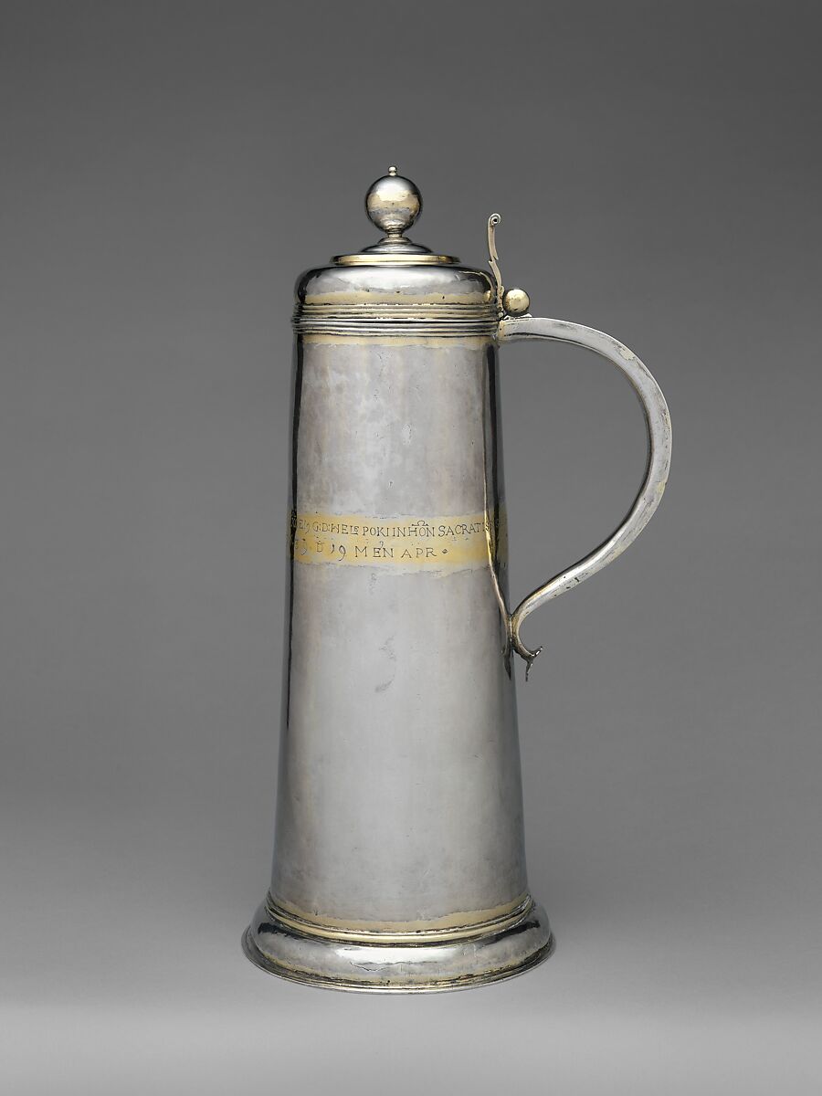 The Latin inscription on this highly restrained and elegantly proportioned jug reads in translation: "The noble lord Andreas Zakany, deputy-lieutenant of the renowned Borsod County, and his wife, the noble lady Helena Poki, had this made for the Evangelical church of Szendrő on 19 April 1639, in honor of the Most Holy Blood of Jesus Christ, the Son of God." Unadorned jugs or flagons capable of holding at least one liter of wine were used for refilling chalices shared among by a Protestant congregation during Communion.