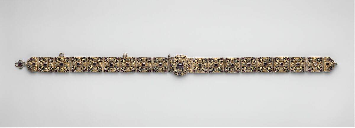 This belt consists of eighteen hinged segments and a larger rectangular section with a round plaque in the center. Additional jewelry or silk tassel ornaments were once suspended from the three attached loops. The various colors of the semiprecious stones and the traces of enamel are reminiscent of sumptuous and exotic Ottoman-inspired designs. At the same time, several details evoke early Medieval– Romanesque– goldsmith work, such as reliquaries from northern Europe that survived at least until the early sixteenth century.