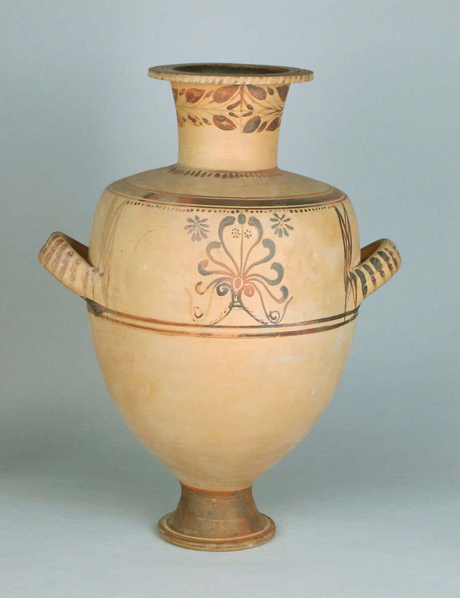 On body, palmette, two rosettes, and network; on neck, laurel sprays.