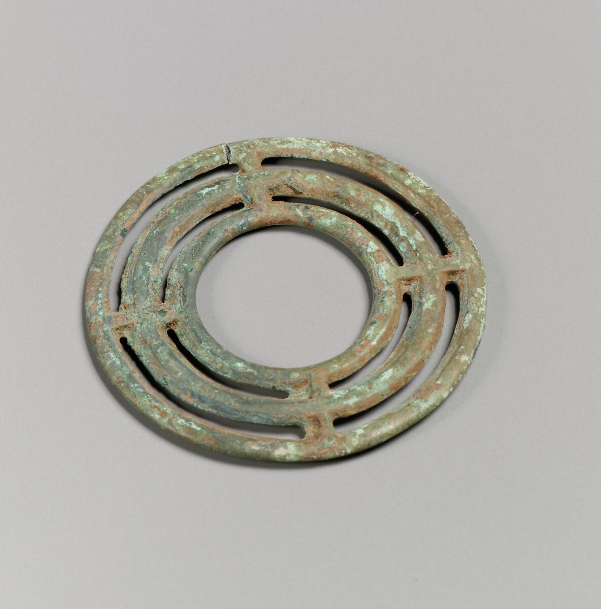 Openwork spiral with three concentric circles linked at 4 points and flat on underside.