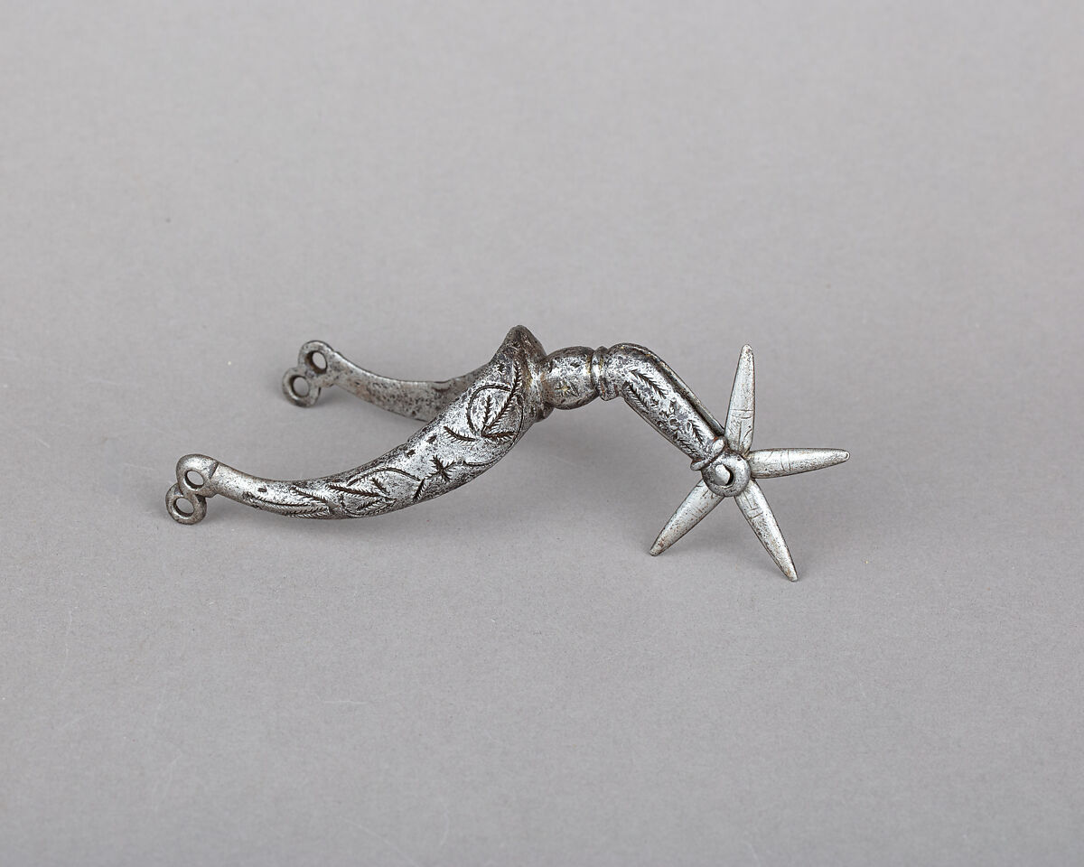 This spur was originally inlaid with silver elements, almost all lost, a type of decoration very popular in Germany in the 17th century. In the first half of the 17th century, the fashion trend for gentlemen was to wear boots and spurs even non-riding circumstances, including for dancing or walking around at court. Spurs became then more than equestrian tools, but pieces of male jewelry often enriched by the same goldsmiths also working on armor and weapons. Their decoration was sometimes intended to match the sword hilt and the general outfit and horse tack of their owner. These trendy accessories were also a significant mark of status for gentlemen, sometimes nonetheless copied by the bourgeoisie. This fashion progressively disappeared after the mid 17th century.
