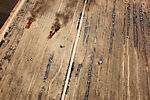 In 2011 the French photographer Frederic Brenner invited eleven prominent photographers to spend six months in residence in Israel and the Occupied Territories, or West Bank, to explore the area’s complexity and to create bodies of work that might broaden and reframe the conversation about the region. Among those invited was Sheikh, an artist best known for his sensitive black-and-white portraits of people living in displaced and marginalized communities around the world. Sheikh’s project takes the form of a trilogy titled Erasure, of which Desert Bloom is the central part. The images were made during several months of flying above the Negev desert and are intended to articulate the rapid transformation of the region. On the one hand, they invoke the Israeli endeavor to “make the desert bloom,” and on the other, they reveal traces of the Negev’s history: the construction of towns for the Bedouin, the natural erosion of the land, the demolition of local dwellings, the remains of military installations, the afforestation campaigns of the Jewish National Fund (JNF), and the transformation of nomadic desert regions into farmland.