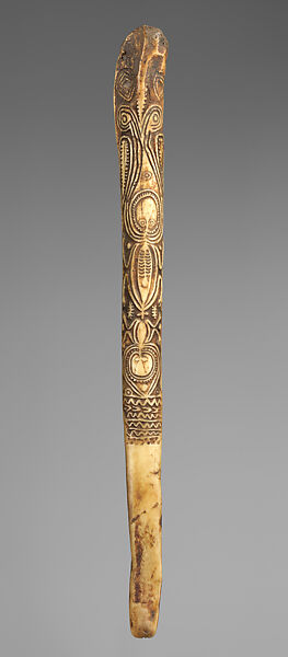 Warriors in the Sepik region formerly employed a variety of weapons. Most, such as spears, were intended to strike the enemy from a distance, but men also carried daggers for use in close combat. With blunt edges and sharp tips, daggers were exclusively stabbing weapons, often used to kill an enemy incapacitated by spears or arrows or, at times, in more stealthy acts of assassination. Many daggers were supernaturally powerful objects that played important roles in male initiation and other ceremonies. Daggers and daggerlike objects were worn as personal ornaments, and many ornate examples with blunt tips may have been ceremonial objects. Daggers were fashioned primarily from the leg bones of cassowaries (large ostrich-like birds) but also, in rare instances, from the femurs of ancestors or enemies.