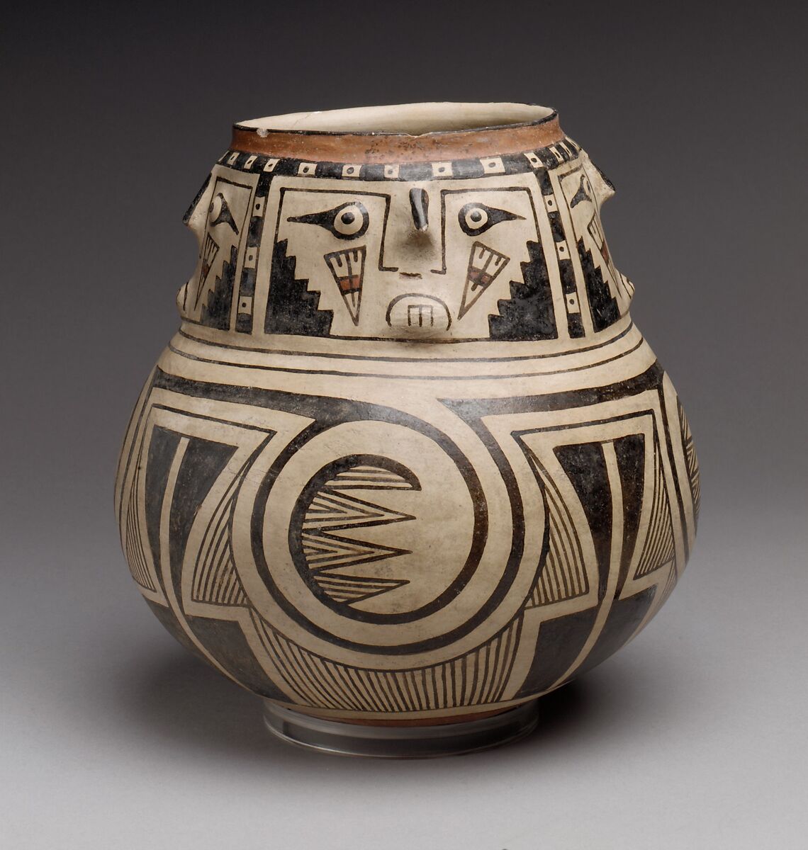 Between the mid-thirteenth and mid-fifteenth centuries, the arid region that stretches from northern Mexico to the southwestern United States was dominated by the powerful city of Casas Grandes. Located in what is now the Mexican state of Chihuahua, Casas Grandes was a well planned urban center made wealthy by trade in precious commodities such as shell, copper, turquoise, and tropical bird feathers. The city's craftsmen, skilled in the working of such materials, increased its wealth by making finished products for export. Among those finished products were ceramic vessels with bright polychrome surfaces. The vessels, principally globular jars, were much esteemed and widely traded. In their manufacture, certain more-or-less standardized systems of shape and decoration were followed that included restrained color schemes—chiefly blue/blacks and brown/reds—geometric patterns, and a particularized use of human and animal imagery. Janus-faced jars are among the vessels, some with the same face on each side, others with different faces. The present example has carried the multiple aspect one step further by incorporating the same face four times onto the top circumference of the jar.