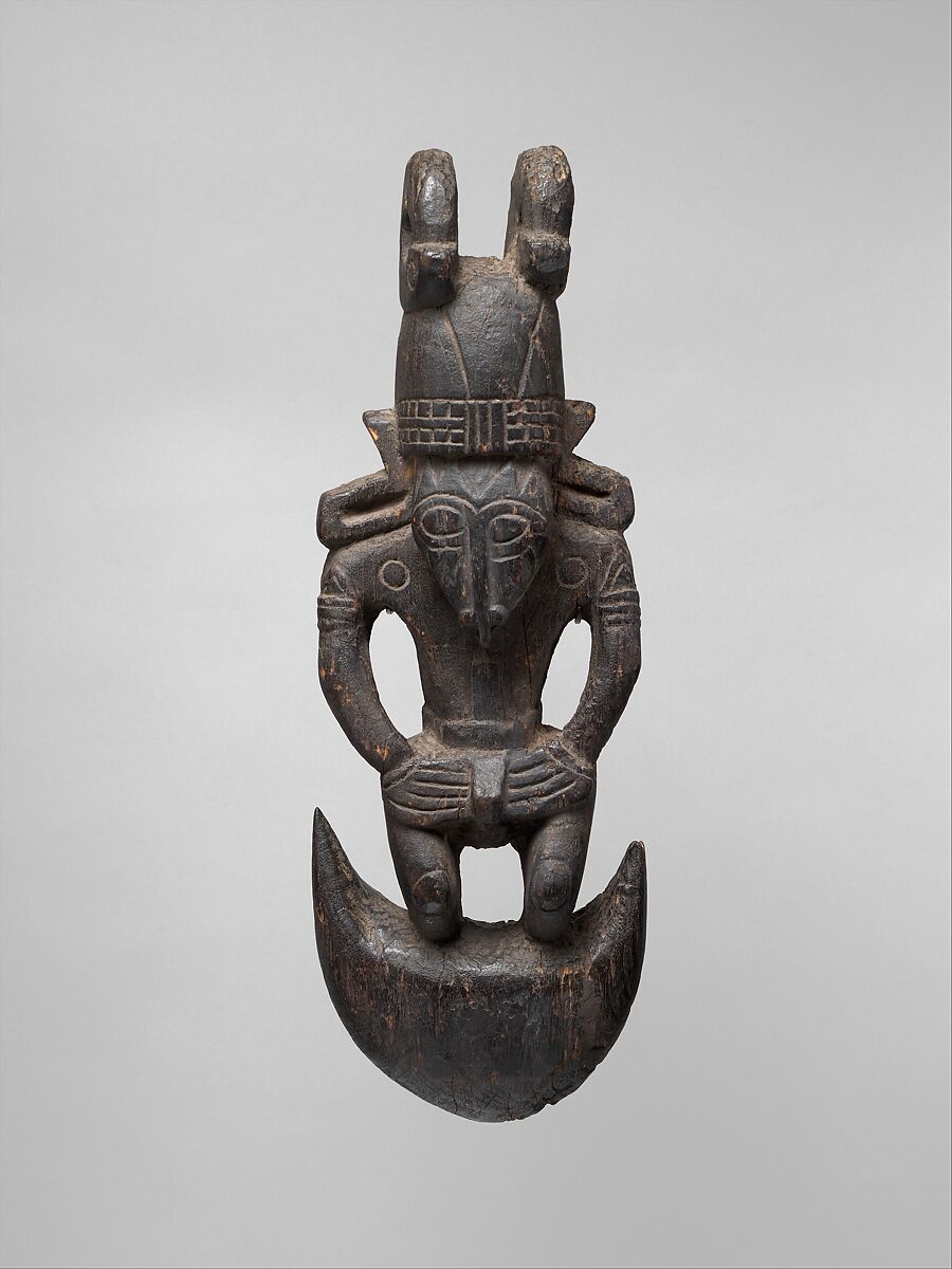 Adorned with a stylized human figure that likely represents a powerful spirit or ancestor, this suspension hook from the Tami Islands was both ornamental and utilitarian. Suspended from the rafters of a dwelling or men’s ceremonial house, it served to keep valuable items, hung from the hook-like projections at the base, out of reach of vermin. The delicacy of the suspension loops on the heads of many Tami hooks indicates that the hooks were likely used for lightweight objects, such as string bags or nets. With its complex interplay between curvilinear and angular forms, the figure embodies the classical elements of the Tami style. It wears a dome-shaped headdress crowned with suspension loops carved in the shape of spiral pigs’ tusks, and the legs merge into the crescent-shaped hook.