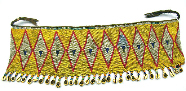 - Medium: Glass beads, cotton yarn, cowrie shells, metal (?)