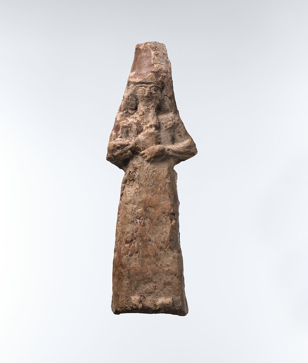 This small baked clay figurine takes the form of a male figure with long hair and beard, staring straight ahead with large, wide-open eyes beneath arched eyebrows. A prominent nose and small, closed mouth can also be seen, although the level of detail in the features is minimal. He presses both fists to his chest, right above left. Shiny areas of the surface are modern restorations in wax. His tall rounded headdress indicates that he is wearing a fish-skin cloak, a garment associated with Assyrian priests that likely connects them with the ancient sages of Mesopotamian mythology who lived in the Apsu, a subterranean realm of fresh water. The figurine was made by pressing clay into a mold, a common method of manufacturing plaques and figurines in Mesopotamia since at least the Ur III period (ca. 2100-2000 B.C.). A thousand years later, during the Neo-Assyrian period, practitioners of magic had developed techniques for protecting interior spaces of buildings by means of a ritual that involved depositing an assemblage of figurines beneath the room’s floor. This figure was found buried under the floor in a room in a palace building at the Assyrian royal city of Nimrud, suggesting that it was intended for this function.