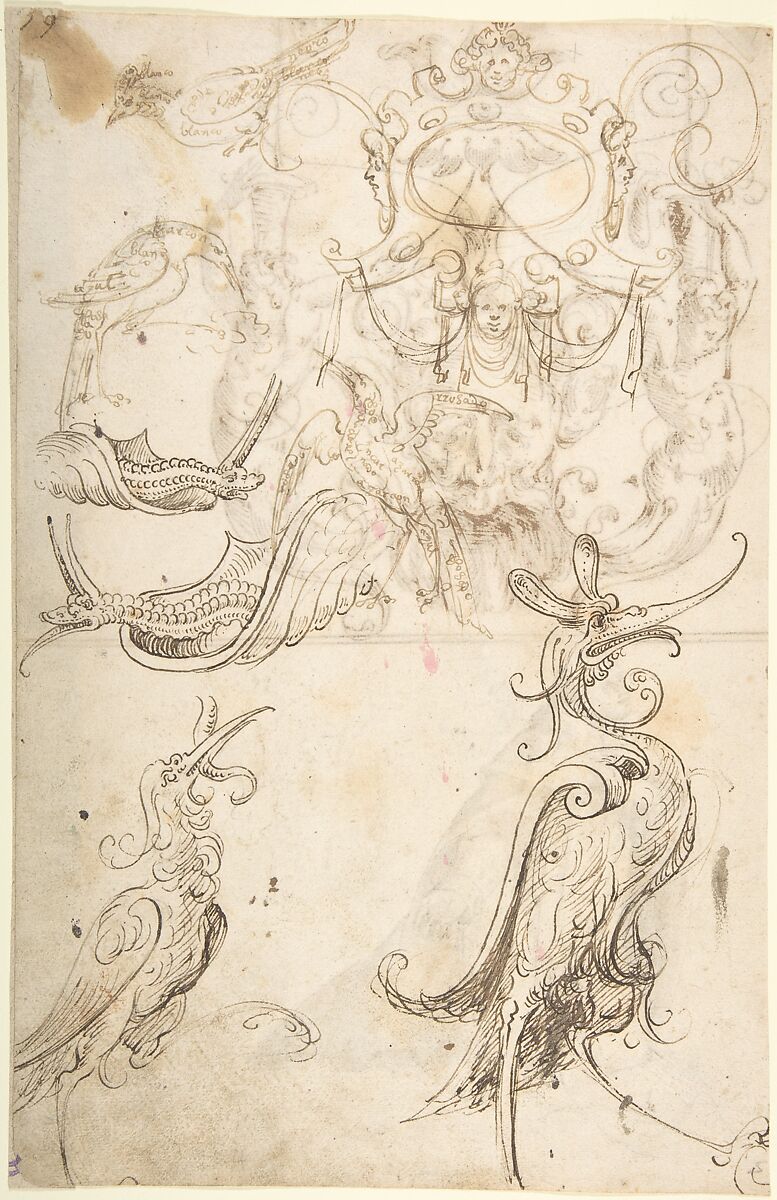 - Title: Fantastical creatures, birds, and strapwork cartouche (recto); grotesque mask and kneeling priest (verso)