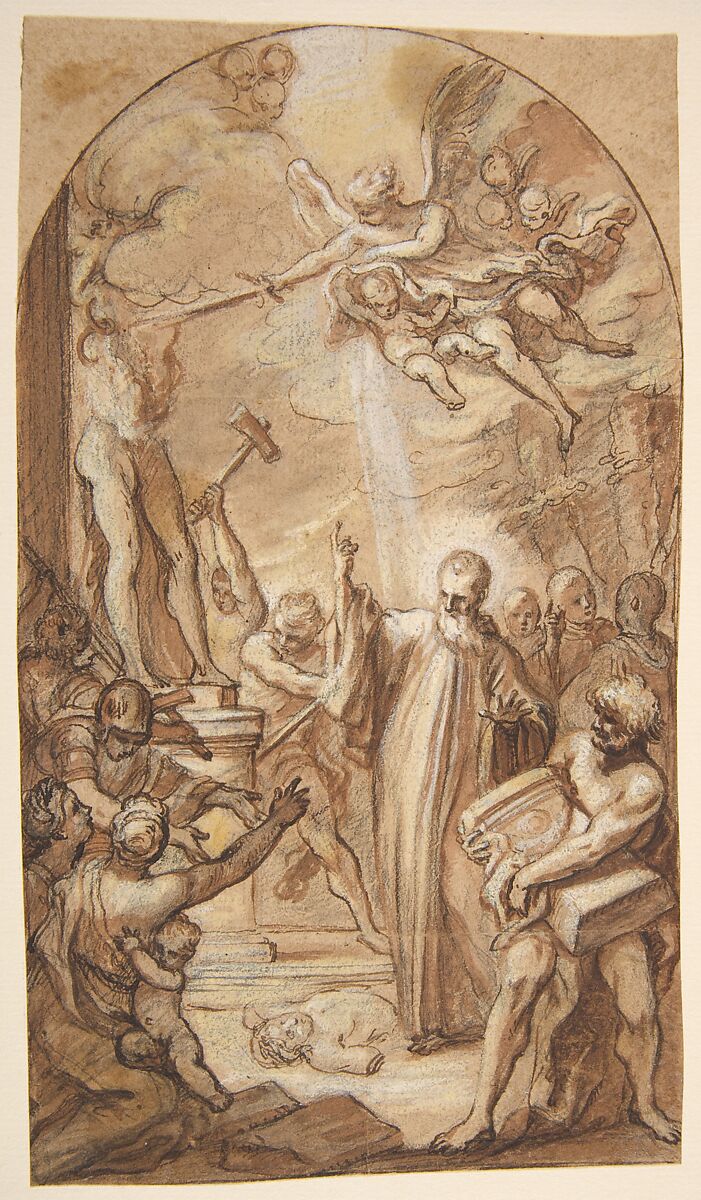 Nearly two decades later, Lawrence Turčić pointed out that the drawing appears to be a preparatory study – although with slight variations - for an altarpiece of the same subject by Sebastiano Conca's close Sicilian follower, Gaspare Serenario. This painting (oil on canvas, 454 x 287 cm), was executed by Serenario in Rome in 1739, shipped to Palermo and eventually installed as the main altarpiece in the church of San Giovanni dell’Origlione. The canvas is now in the local Museo Diocesano of Palermo. The iconography of the drawing explains the foundation of the historic abbey of Montecassino by St. Benedict of Nursia (ca. 480- 543 AD). Once arrived on a rocky hill at the south of Rome (Monte Cassino), Benedict destroyed the pagan idols - remains of the previous Roman domination - and placed the first stone for the erection of the new Christian abbey.
