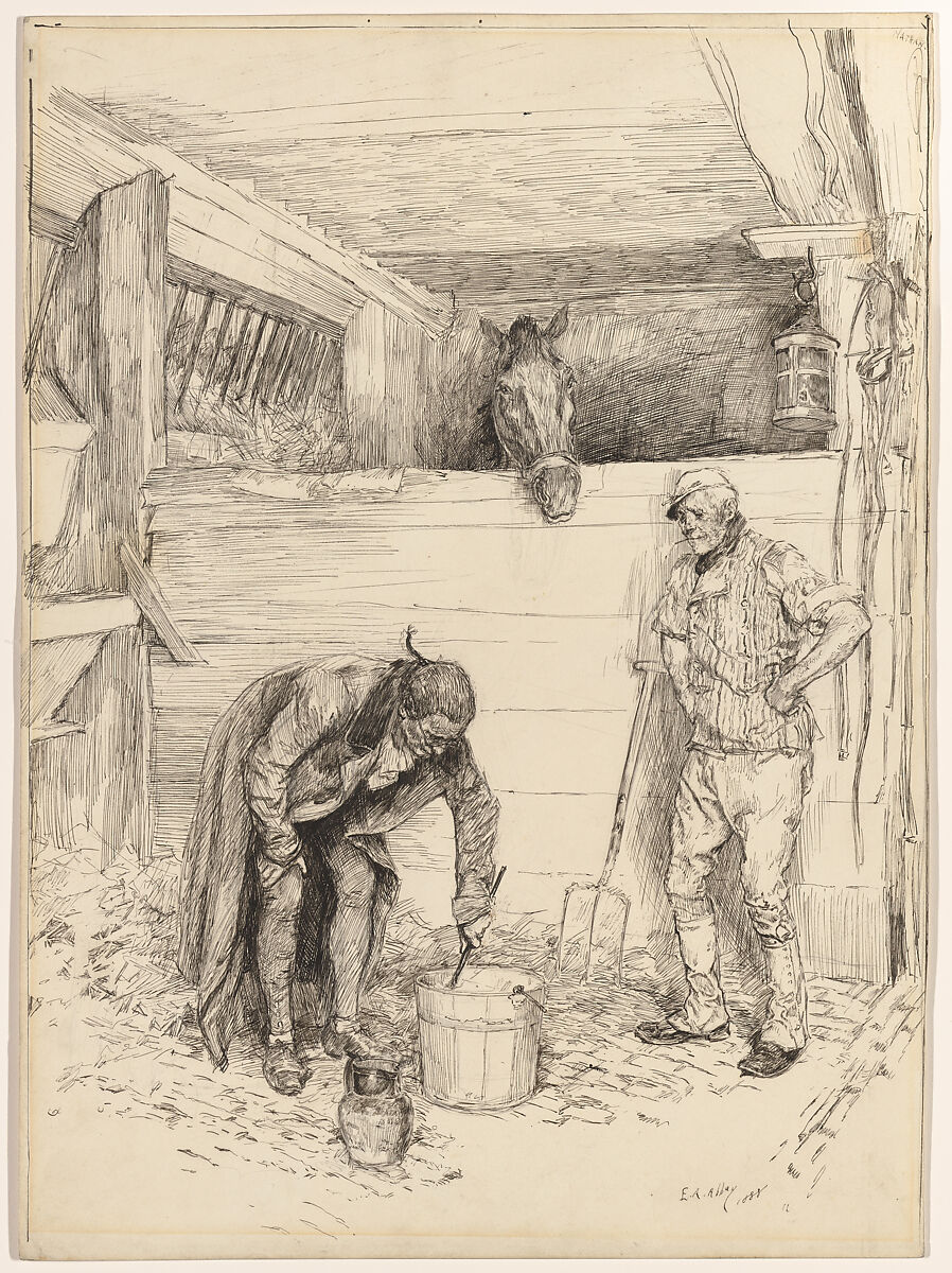 Abbey moved to England in 1878 to research illustrations to historical poems for Harper's and settled there permanently in 1883. This drawing is one of a series that responds to "Everyday Characters," poems by the British poet W. Mackworth Praed. We see the elderly bachelor Quince, a denizen of a West Country village, feeding his horse. The related stanza reads: