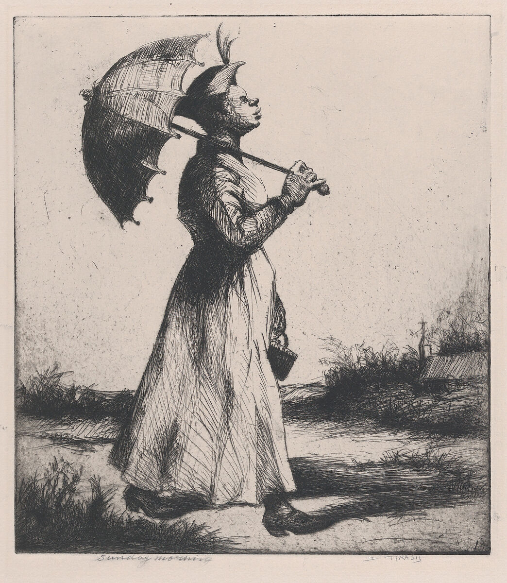Thrash left his native Griffin, Georgia as a teenager, seeking work and artistic training opportunities in cities across the northern United States. He settled in Philadelphia in his early thirties and often drew on memories of growing up in Georgia for subject matter, as in this work that pictures a woman walking in a rural setting, possibly dressed for church. Thrash is best known for developing carborundum printmaking processes while working at the Fine Print Workshop of Philadelphia, a printmaking workshop established under the Work Projects Administration (WPA), in the late 1930s and early 1940s. But Thrash was skilled in a number of printmaking techniques, and Sunday Morning demonstrates his command of drypoint etching, in which layers of black lines are applied to model volume and form.