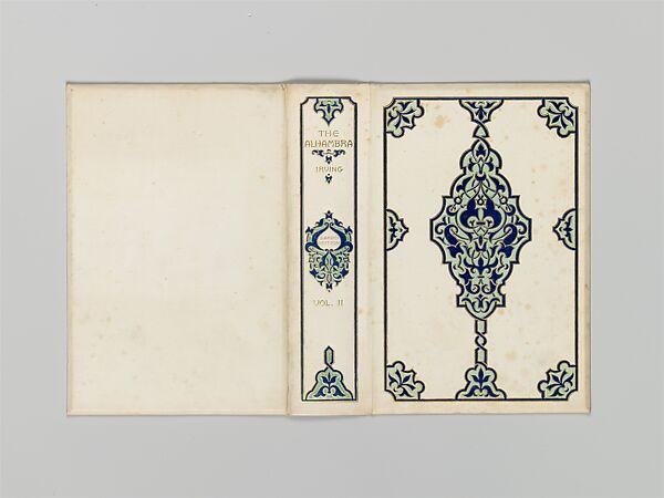A leading New York late nineteenth century book-cover designer, Morse studied at the Woman’s Art School of the Cooper Union, then under John La Farge before working for Louis C. Tiffany as a painter and designer of stained glass. In 1887 she began to concentrate on book-covers, fufilling eighty-three commissions for New York commercial publishers by 1905. Putnam's companion gift books, "The Alhambra" and "The Conquest of Granada," both for works written by Washington Irving, are two of Morse's most elaborate designs. Each volume is bound in white plain-weave cloth and stamped in colors and gold, with the ornament recalling "Moresque Ornament from the Alhambra," no. 3, plate XLI in Owen Jones's famous "Grammar of Ornament." An example of this cover was shown at the Woman's Building at the World's Columbian Exposition at Chicago, in 1893.