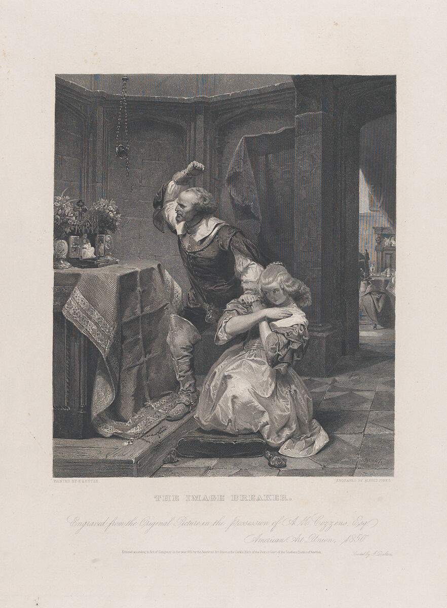 Based on an 1847 painting by the German-American artist Leutze, this work dramatizes religious differences that divided families during the English Civil War. A father has interrupted the Catholic devotions of his daughter and prepares to smash devotional objects on a small altar. The print was published by the American Art-Union, a New York institution that boasted nearly nineteen thousand subscribers at its height in 1849-50. For an annual fee of five dollars, each member received a large, finely engraved, print and was entered in a lottery to win original artworks which were exhibited at the Art-Union's Free Gallery. Aimed at educating the public about contemporary American art, the group's distribution network reached members in every state. This contributed to the creation of a national market for landscapes and genre paintings. The system flourished for a limited period, however, with no lottery taking place in 1851, the year that the Art-Union issued this work as part of a set of small engravings titled "Gallery of American Art, No. I."