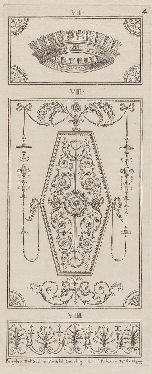 These designs for panels of ornament, numbered VII to VIIII, include a crown formed out of a ring of fortified towers above. At centere there are foliage motifs, ribbons and beaded swags and a Greek anthemion below. The print comes from a group that Pergolesi made and published serially in London between 1777 and 1792. There is no title page, but a prospectus of ca. 1786 described the group as: "A great variety of original designs of vases, figures, medallions, friezes, pilasters, panels and other ornaments, in the Etruscan and grotesque style." The complete set contains 67 plates numbered 1-66 (two are numbered 56), with designs within the plates irregularly numbered 1-435 (in Roman numerals at first, then with Arabic numbers). In 1801, after Pergolesi's death, four additional plates of designs were published by a bookseller Dulouchamp (or Dulonchamp).