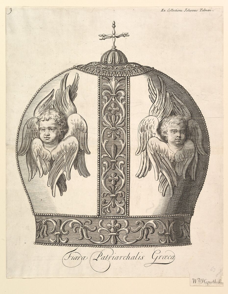 Hogarth made this print early in his career to illustrate a travel book by the French author Aubry de La Mottraye. Related text describes this Patriarchal Cap or Tiara... in the Shape of an Imperial Crown as based on the that of "Methodios, an ancient Patriarch of Constantinople, brought from thence to Rome."