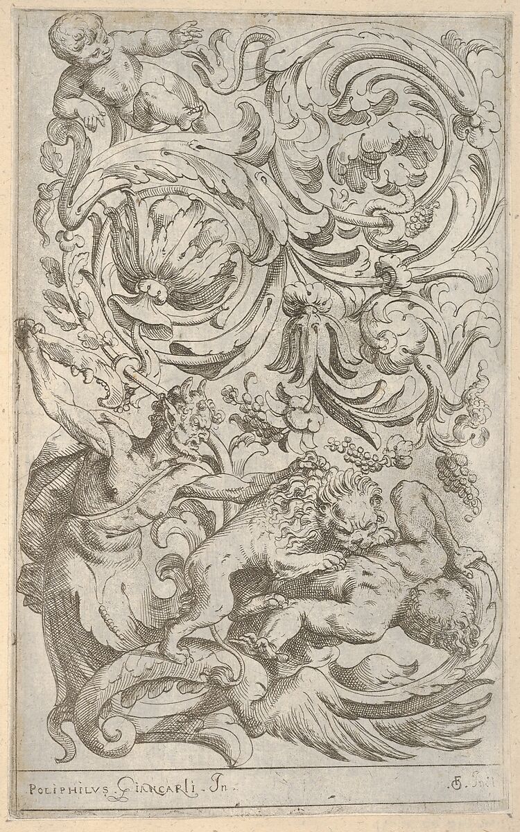 Vertical panel design with an acanthus rinceau. The lower half of the print shows a satyr attacking a lion with part of a jaw bone. The lion in turn is attacking a male figure whose lower body consists of acanthus leaves. Above in the rinceau a putto is depicted.