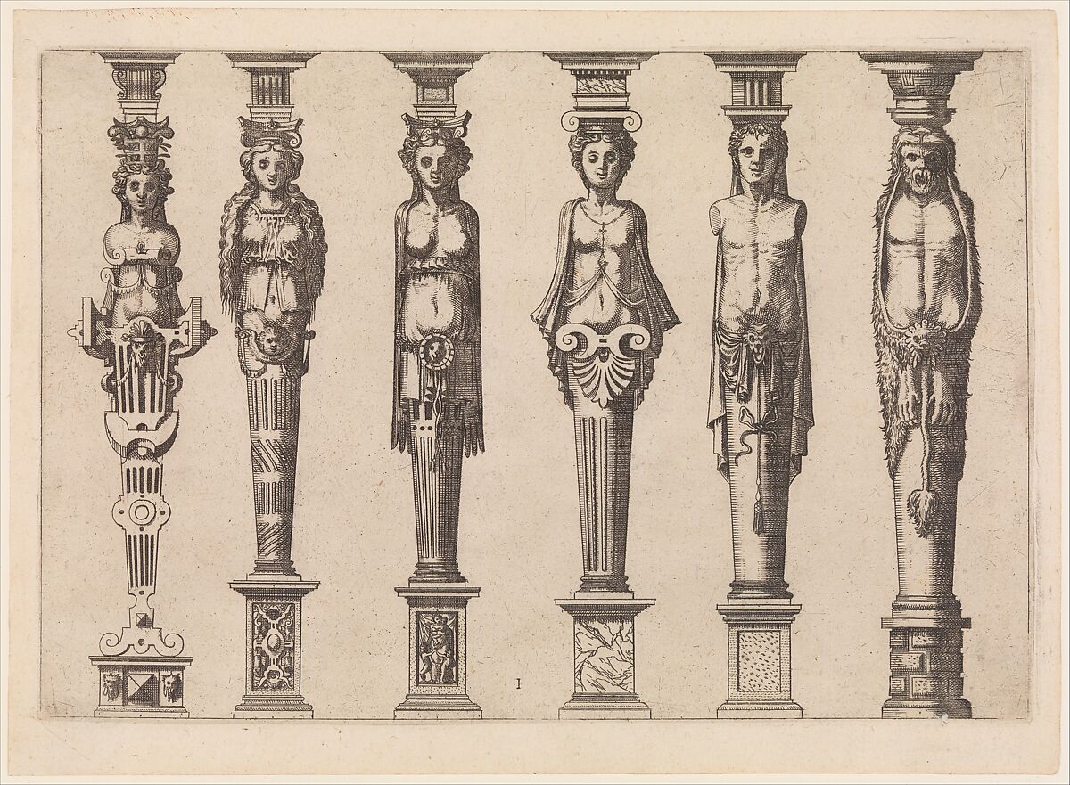 - Title: Six terms, four female and two male, with Hercules at far right, plate 1, from Caryatidum [...] sive Athlantidum multiformium ad quemlibet Architecture ordinem Accommodatarum centuria prima [...]