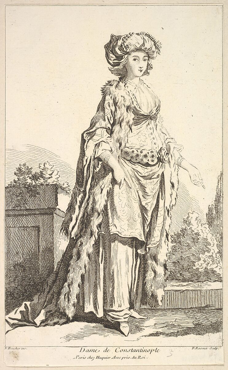 - Title: Dame de Constantinople, plate 5 from "Recueil de diverses fig.res étrangeres Inventées par F. Boucher P.tre du Roy et Gravées par F. Ravenet" (Collection of Various Foreign Figures, Devised by F. Boucher, Painter of the King and Engraved [etched] by F. Ravenet)