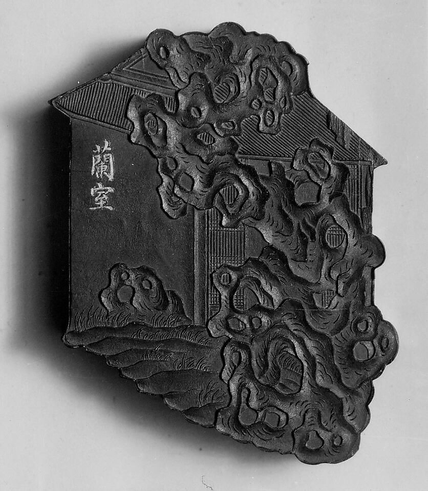 This ink tablet is from a sixty-four-tablet set (30.76.216–.279) commissioned by the Jiaqing emperor from the Studio for Appreciating the Antique (Jiangu Zhai) manufactory of the Wang Jinsheng family in Huizhou, Anhui Province. Each ink tablet commemorates a hall or pavilion in one of the imperial gardens. Each site’s name is written in gilt characters on one side; a view of the site is presented on the other. Such inks were purely decorative and not intended for use.