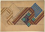 Frieze with Striped Ribbon Overlapping a Lozenge with a Cloverleaf Motif, from a group of 158 textile designs from an unidentified French designer. The designs include brightly colored patterns and single motifs in late Art Nouveau and Art Deco styles. Most designs have been made on tracing paper and show signs of transfer. Some include instructions for execution, written in French.