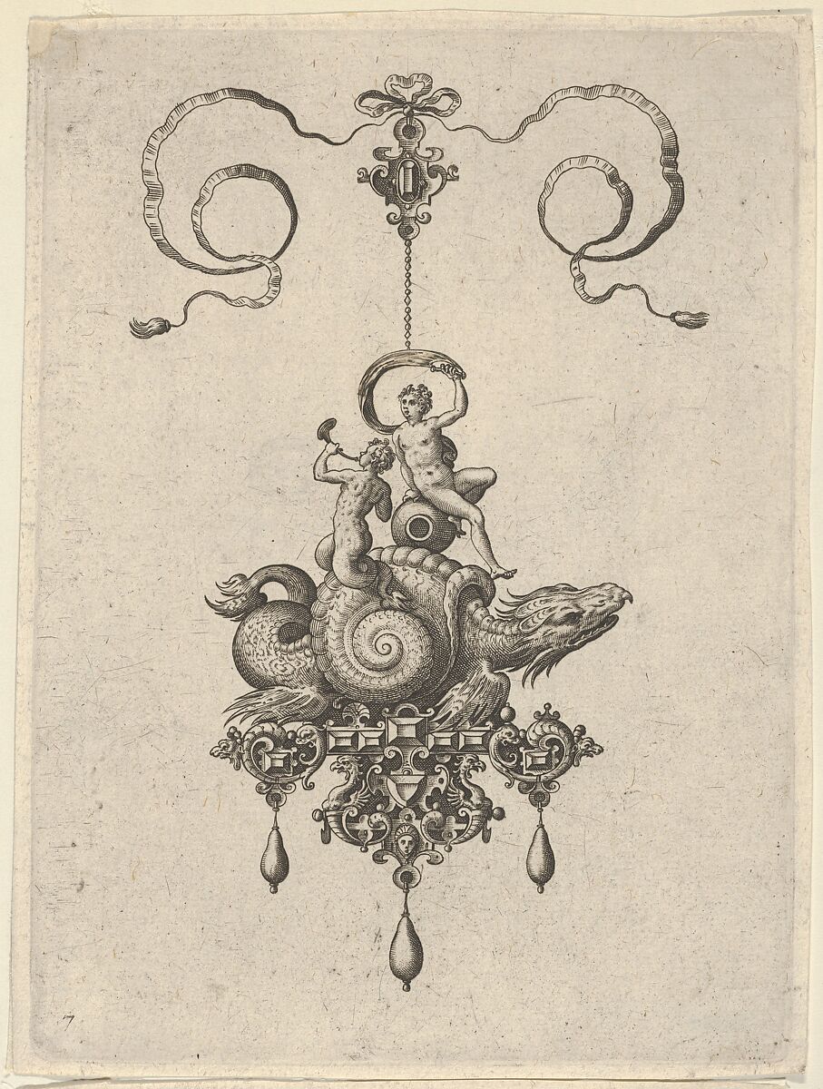 Vertical panel with a pendant in the shape of a sea monster in a shell ridden by a triton blowing a horn and a woman with a sail. The ornament is suspended from a small jewelled motif tied with a ribbon at top. Plate 7 from a series of ten plates with pendant designs in the shape of sea monsters. The series, known as Designs for Pendants II, was engraved by Adriaen Collaert, after designs by his father, Jan Collaert I, who died in 1580. Jan Collaert I produced several series of pendant designs, including the prequel to this series, Designs for Pendants I. This print belongs to the first edition, published in Antwerp by Philips Galle in 1582.