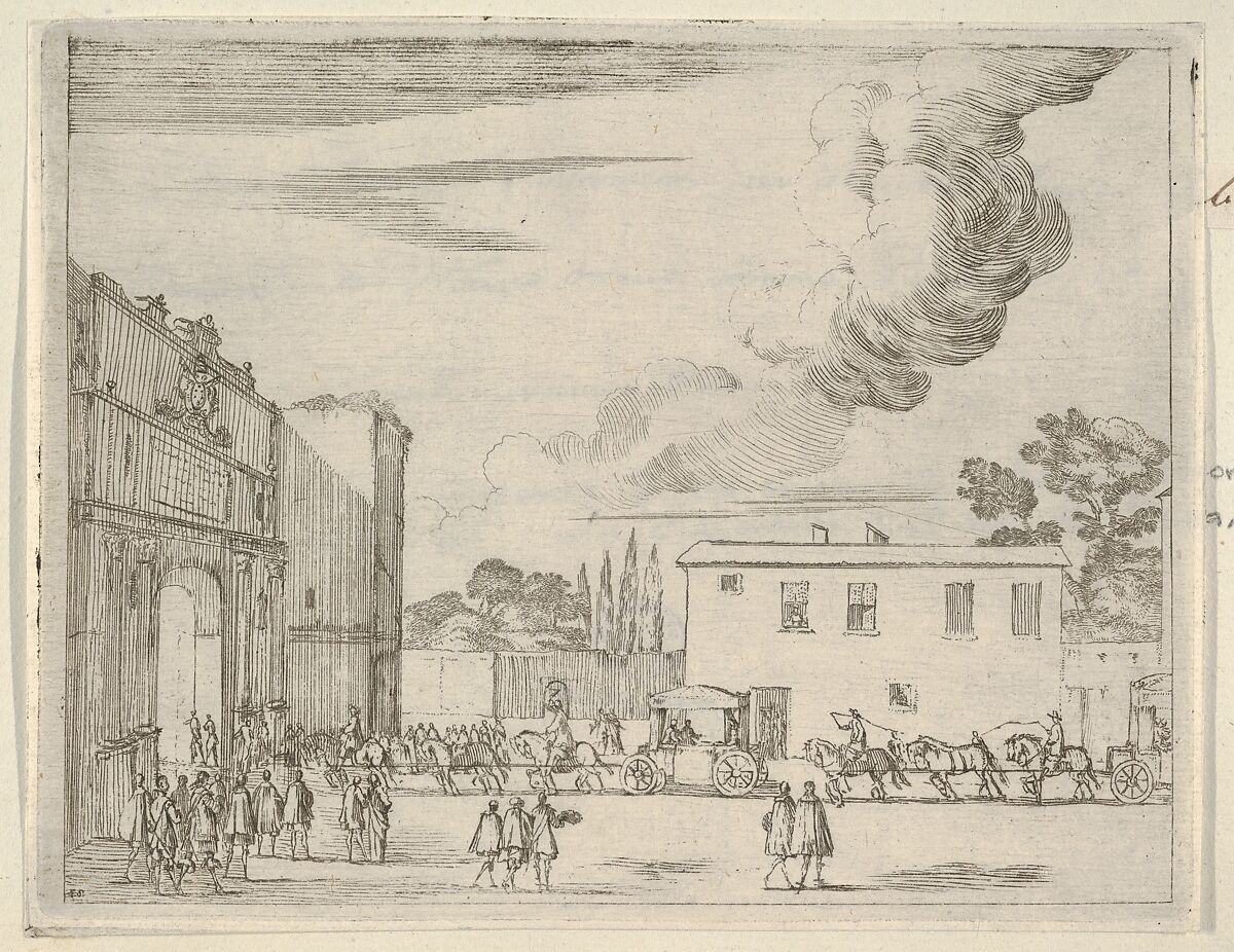 This print is from L'Idea di un Principe ed Eroe Cristiano in Francesco I d'Este, di Modena e Reggio Duca VIII [...] collected in an album of brown boards. Four prints are hinged on each page of the album with a seventeenth- or eighteenth-century inscription pasted beneath the print on the album page. The prints are etched in the manner of Callot and illustrate Francesco I d'Este's virtuous nature as a ruler in battle, in religious matters, and in daily life. Three of the prints are signed by Jean Sauvé, who presumably worked with Fenice on the execution of the illustrations for this book. There are sixty-seven copper plates and forty-five preparatory drawings in the Museo Civico di Modena.