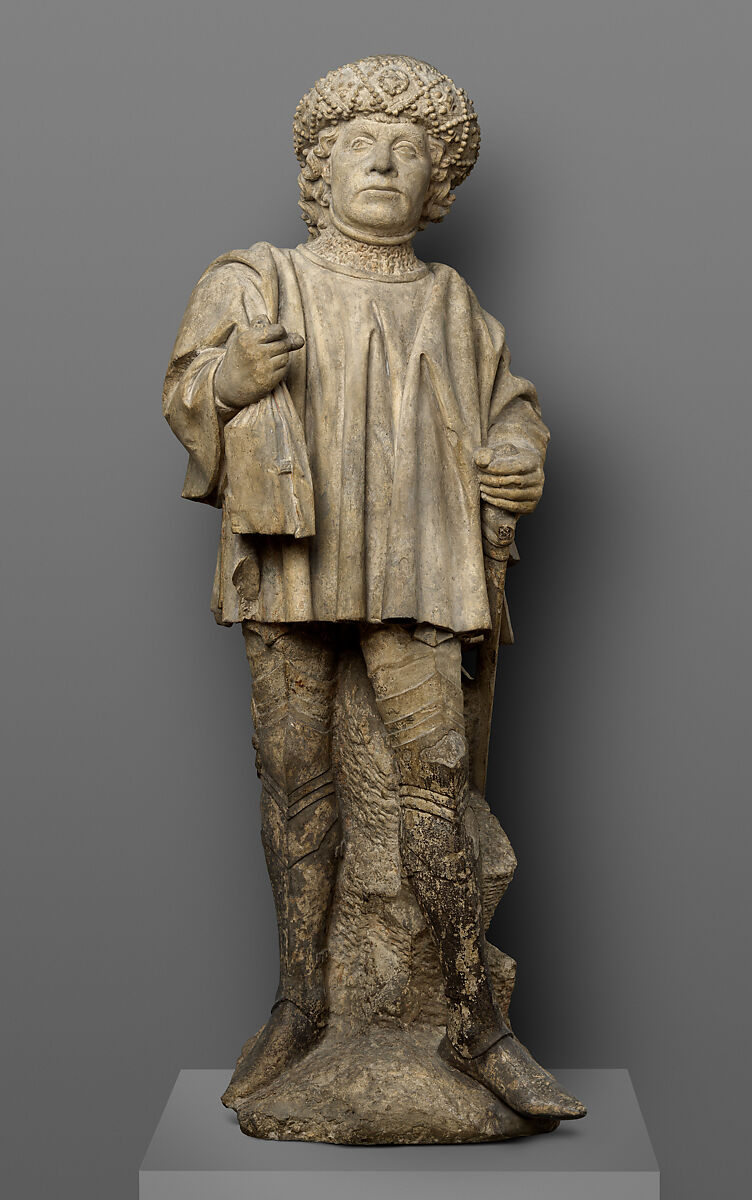 Though this man has the armor, sword, and swagger of a soldier, the jewels on his hat imply a pompous love of luxury. The combination identifies him as Saint Bavo, who was transformed from a spoiled aristocrat to a humble monk after hearing a Christian sermon. Here, he grasps a leather-bound book that conveniently forms a bag when closed, allowing it to be carried or hung from a belt. To medieval eyes, it was both a fashionable commodity associated with Bavo’s wealth and a reminder of the profound power of sacred texts.
