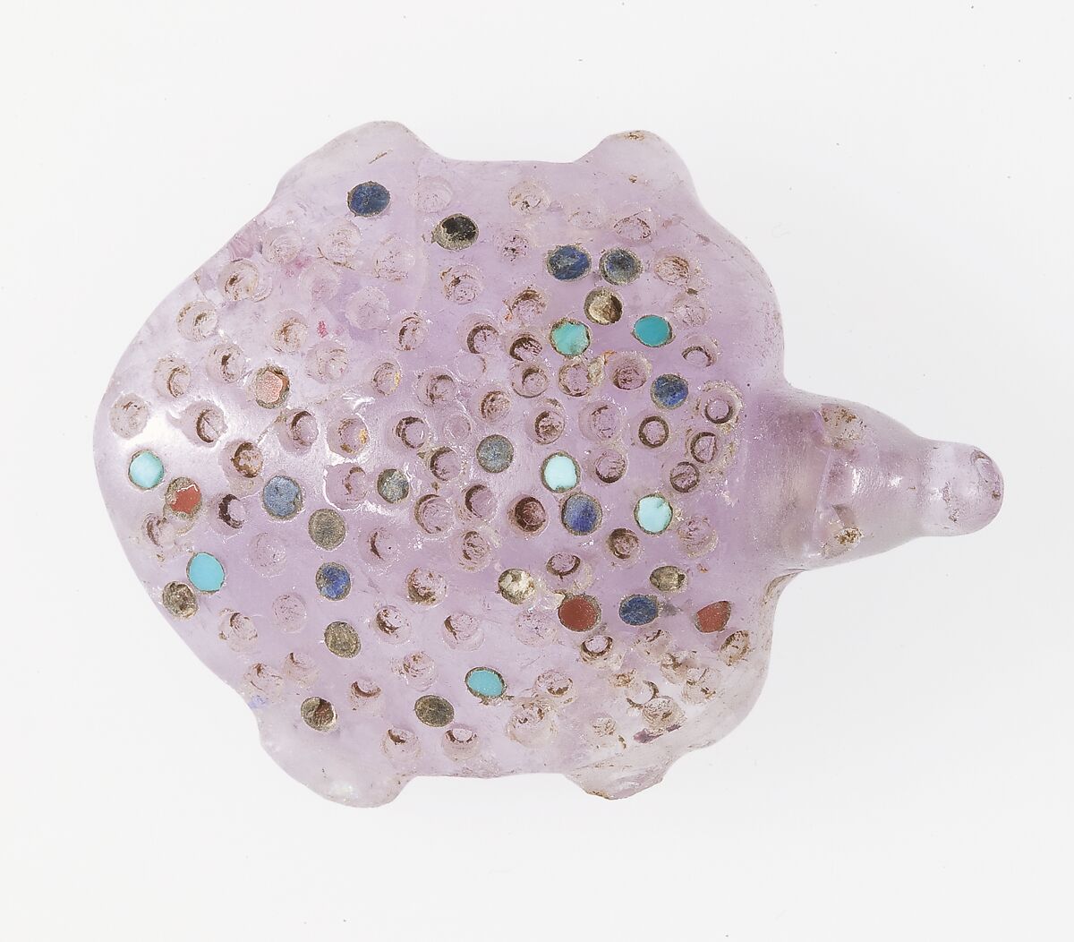 This exquisitely manufactured figurine represents an African soft-shelled turtle, Trionyx triunguis. Created from amethyst, a difficult stone to carve, this turtle’s back was inlaid with tiny semi-precious stones designed to imitate the stippled pattern found on the animal’s shell.