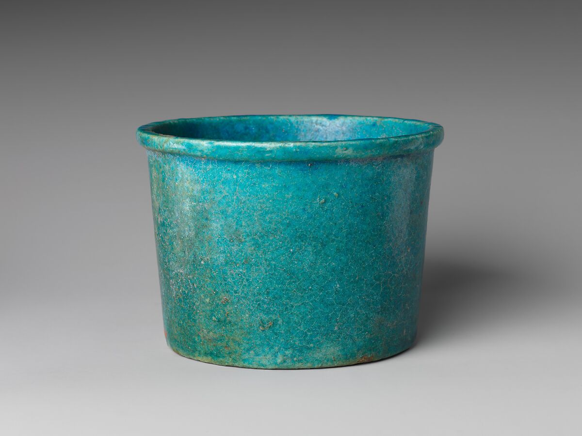 Faience cups of this type are frequent in the Late Period. A recent study of faience vessels notes that examples were found in the western dump at the Sacred Animal Necropolis at Saqqara, where datable documents belong to the 5th-4th centuries B.C. The cups vary in size; examples are known that were inscribed and found in sets of 7 for the 7 sacred oils. The type may have continued to be produced during the Greco-Roman period, but the quality of the glaze here - very thick and most often with craquelure in a regular manner - is considered characteristic of the Late Period.