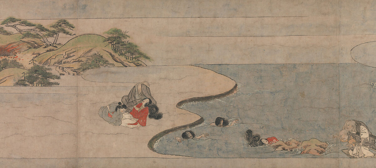 This scene, a detached section from a set of three illustrated narrative handscrolls (emakimono), presents the conclusion of the amorous tale of a Buddhist monk and his young acolyte, who in a previous scene has taken his own life by drowning. A procession for raigo-e, a ritual ceremony celebrating Amida Buddha and his retinue of bodhisattvas, descends and crosses a bridge to welcome the souls of the departed and guide them to paradise with music and song.