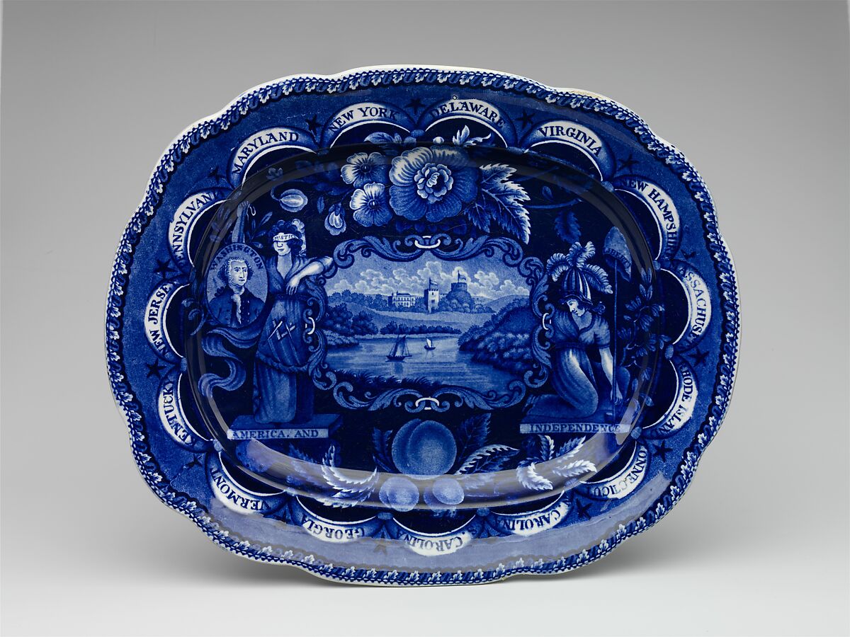 This dark blue and white transfer-printed earthenware platter made by the Staffordshire firm of James & Ralph Clews features a view from the "America and Independence" series illustrating approximately fourteen buildings surrounded by the "States" border produced for the United States export market. The series is also known as the "Arms of the States." Although a few buildings in the series are sometimes identified as American, most appear to be anonymous English structures like the castle in the present view. The border for the series typically contains the names of fifteen states in swags of ribbon separated by stars. However some pieces include the names of eighteen states. To the left of each view an allegorical female figure wearing a blindfold inscribed "JUSTICE" holds an oval portrait medallion of the nation's founding father, George Washington (1732–1799). To the right an allegorical female figure symbolizing American independence from Great Britain holds a liberty pole with a Phrygian cap inscribed “LIBERTY." The title of the series, "AMERICA AND INDEPENDENCE,” appears beneath the two figures. The American Wing's collection contains additional pieces by Clews, including others from the same series. Refer to the Dictionary for a definition of the term "transfer printing" and for information about Clews.