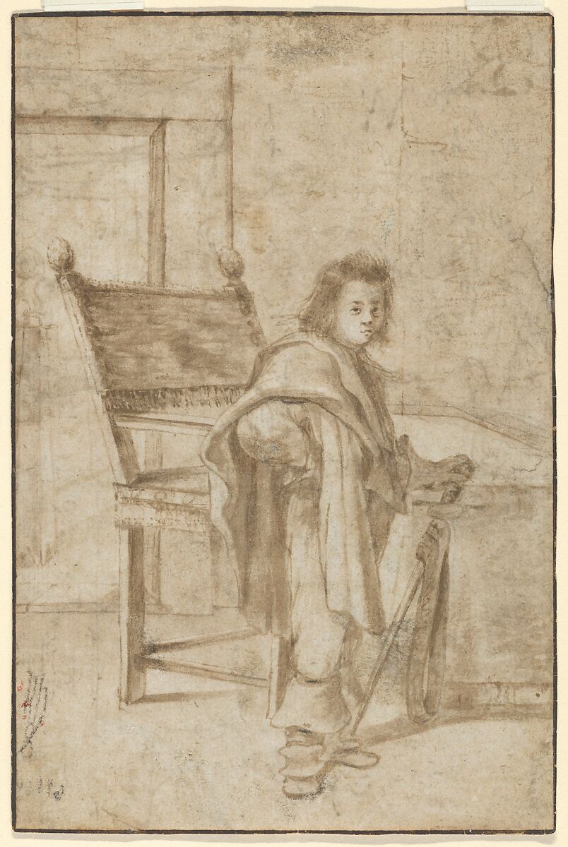 In a simple interior, a boy wearing an ample cloak stands near a chair and table, holding a sword and looking tensely at the viewer. Through the doorway in the left background, a sculpted bust on a wooden pedestal is visible. The drawing is a somewhat unusual example of the kind of genre scenes produced by numerous mid-seventeenth-century Dutch artists, depicting the young boy in a role usually reserved for a gentleman or soldier, and lending a slightly eerie character to the scene. The author of the drawing has not yet been identified; one of the monograms on the verso may offer a clue. The former attribution to Anthonie Palamedesz. (1601–1673), known for his interior scenes with soldiers, cannot longer be upheld, as is clear from a comparison with, for instance, a figure study by that artist in the Museum’s collection (acc. 2000.22).