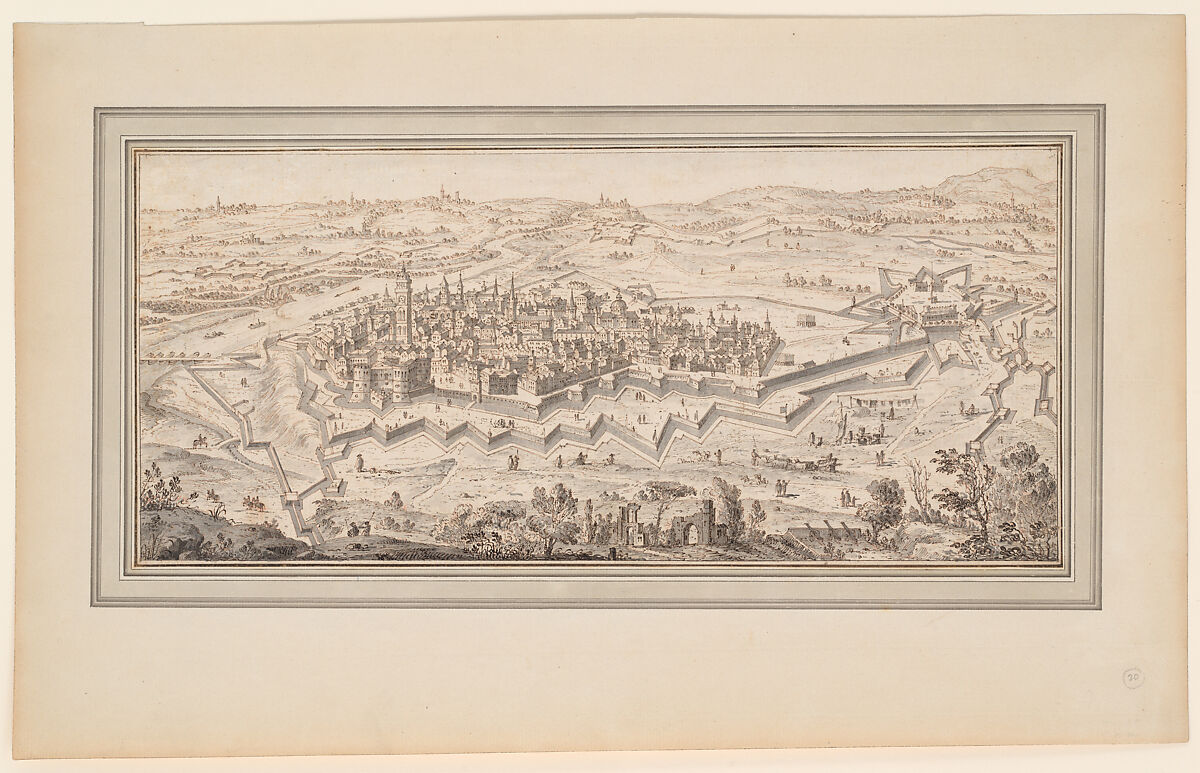 Large horizontal sheet with a detailed rendering of a birds-eye view of the city of Casale di Monferrato in Piemonte. In the seventeenth century, the city was under French rule and during that time, Louis XIV’s great military strategist, Sébastien Le Prestre de Vauban (1633-1707) applied his ideals for the city walls and battlements to the medieval plan of the town, which are clearly visible in this rendering of the city in birds-eye view. by Francesco Zucchi. The Italian artist was known for his precise landscapes and city views, which were often made in preparation for a print or book illustration.
