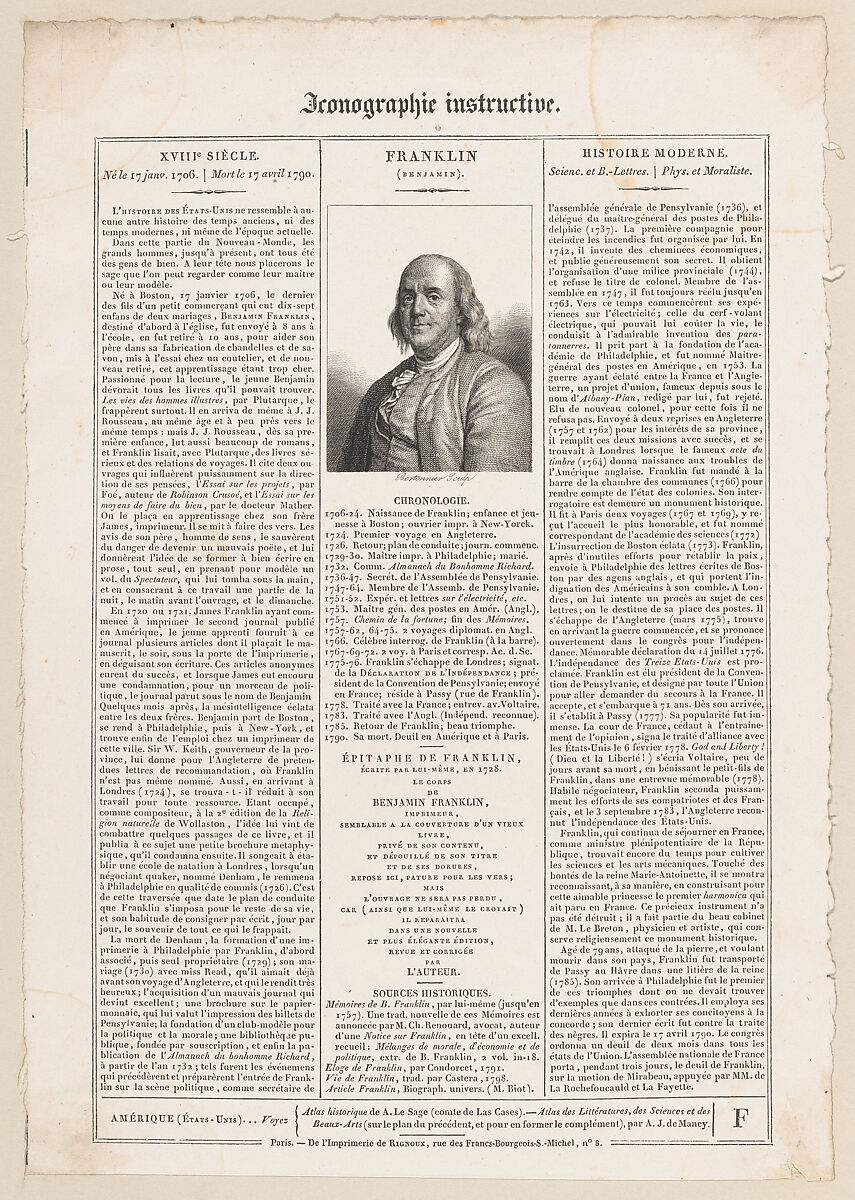 - Title: Sheet from "Iconographie Instructive" with portrait of Benjamin Franklin
