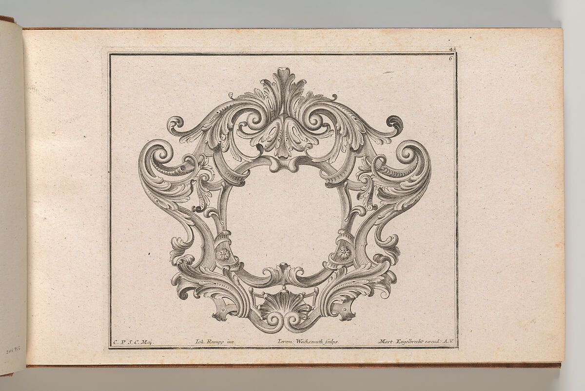 Ornament print with a design for a cartouche, bound in an album containing 27 series with a total of 122 ornament prints from the fund of the prominent Augsburg publisher Martin Engelbrecht.