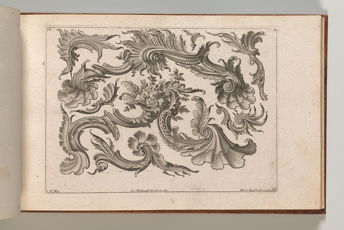 Ornament print with designs for rocaille ornaments for various applications, in the center one of the ornaments forms a cornucopia. This print is bound in an album containing 27 series with a total of 122 ornament prints from the fund of the prominent Augsburg publisher Martin Engelbrecht.