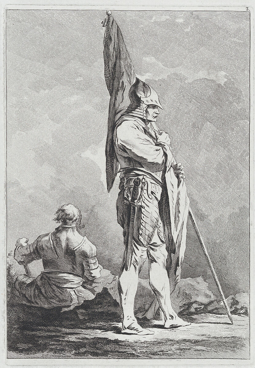 This print comes from a set of "Eight Studies of Soldiers" (2018.54.1-.8) designed by Loutherbourg during his Paris years, 1755–71. While himself an accomplished printmaker, Loutherbourg here turned the etching over to the Zurich-born Matthias Pfenninger, then studying in Paris. The images demonstrate admiration for the Italian 17th-century printmaker, Salvator Rosa.