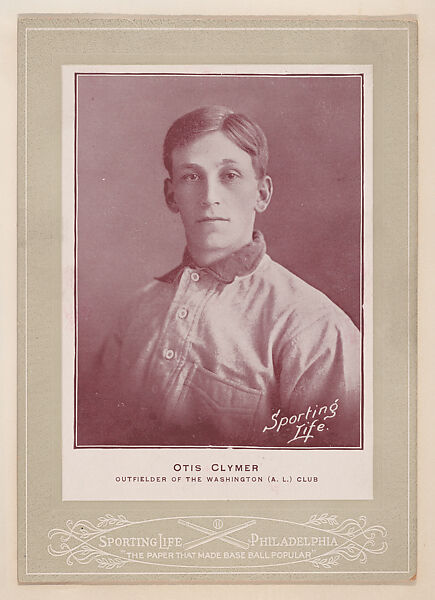 Otis Clymer from Sporting Life Cabinets (W600). Issued from 1902 to 1911 by Sporting Life Newspaper Company, Philadelphia. Set consists of over 680 unnumbered cards. Player portraits are by photographer Carl Horner. Black and white or color tinted player photo. Player's name, position and team printed below studio portrait. Player shown either in uniform or in street clothes. Mounted on a thick cardboard frame. Issued in individual glassine envelopes. Ornately embossed mounts found in one of four design variations. Blank back. Sponsor ad stamped on back of some cards.