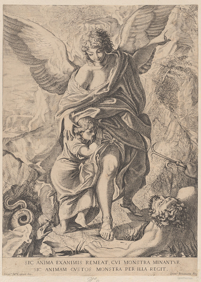 - Title: Guardian angel leading a child through danger, with a snake at lower left and a demon at lower right