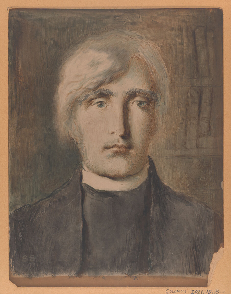This portrait of a priest should be seen in the context of earlier works, where Solomon explored Roman Catholic,Orthodox and Jewish religious ceremonies and rituals, using rich colors, somber gestures and liturgical objects to point to invisible divine forces. The sitter's white hair contrasts with youthful features that seem to project an inner light; and the books lining shelves in the background point to a contemplative life. An imprecise inscription at lower left indicates a date of 1897–close to the end of the artist's life. Even as he suffered through rejection, poverty and alcoholism, Solomon continued to make meaningful works, occasionally forced to seek shelter in London's St. Giles's Workhouse.