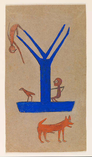 Born into enslavement in rural Alabama, Traylor—one of the most distinctive Black artists of the twentieth century—experienced dramatic historical change in the United States firsthand, including emancipation, Reconstruction, Jim Crow segregation, and the Great Migration. About 1939, at the age of eighty-six, Traylor began drawing urban life around him in Montgomery, Alabama, and revisiting events from his own past. Working with a strong sense of design and storytelling, his renderings are striking in their disregard for spatial depth and proportion. Traylor would create more than one thousand pencil drawings and gouache paintings on pieces of found cardboard, including this engaging composition with a dog, bird, and two human figures, one teetering from a tall central construction.