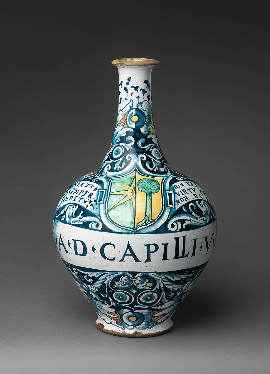 The Latin mottos "Virtue always burns" and "Virtue has no value if one has no faith" may relate to the bottles’ owner, whose coat of arms appears between the inscriptions. Prominent labels indicate that the vessels (see also 02.5.58) once held extracts of wood bettony and maidenhair fern.