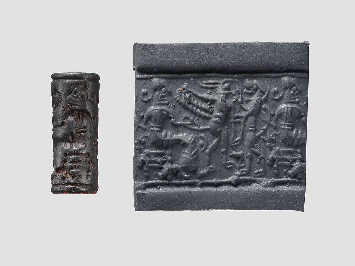 - Title: Cylinder seal and modern impression: confronted upright lion and griffin before a seated figure
