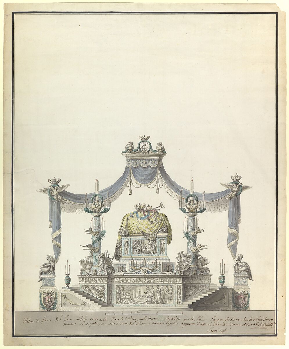 View of the side elevation of the catafalque designed by Brenna for the burial of Catherine the Great of Russia and her husband Tsar Peter III (died 1762) held in the Cathedral of Saint Peter and Paul in November 1796.
