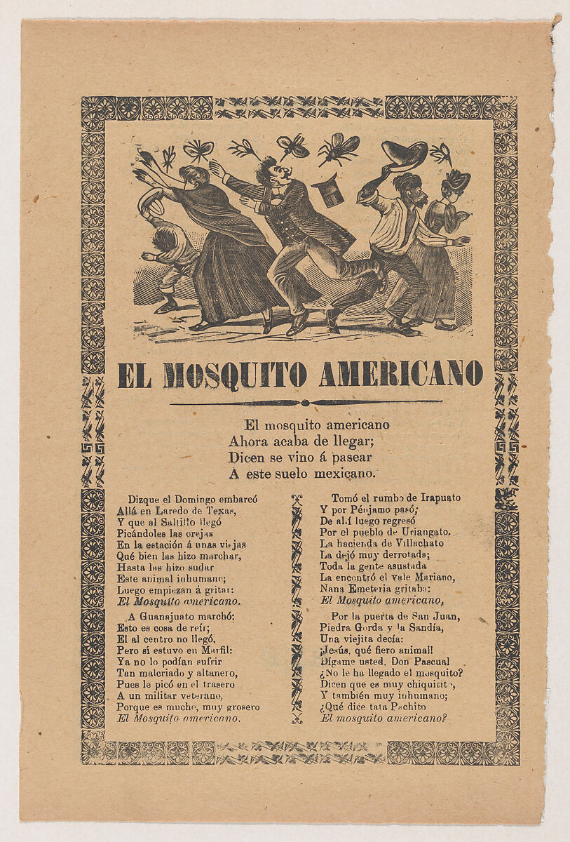 Hundreds of broadsheets addressing current affairs and illustrated by Posada were published by the Vanegas Arroyo workshop. This example has twelve ten-line stanzas covering both sides that relay verbal accounts from different parts of Mexico regarding the damage inflicted by "American pests." The stories seem to relate to US expansionism and intervention in Mexico enabled by Porfirio Díaz’s government. The image shows Mexicans of different ages and classes being attacked by mosquitos that are described in the text as inhuman, tyrannical, and rude.