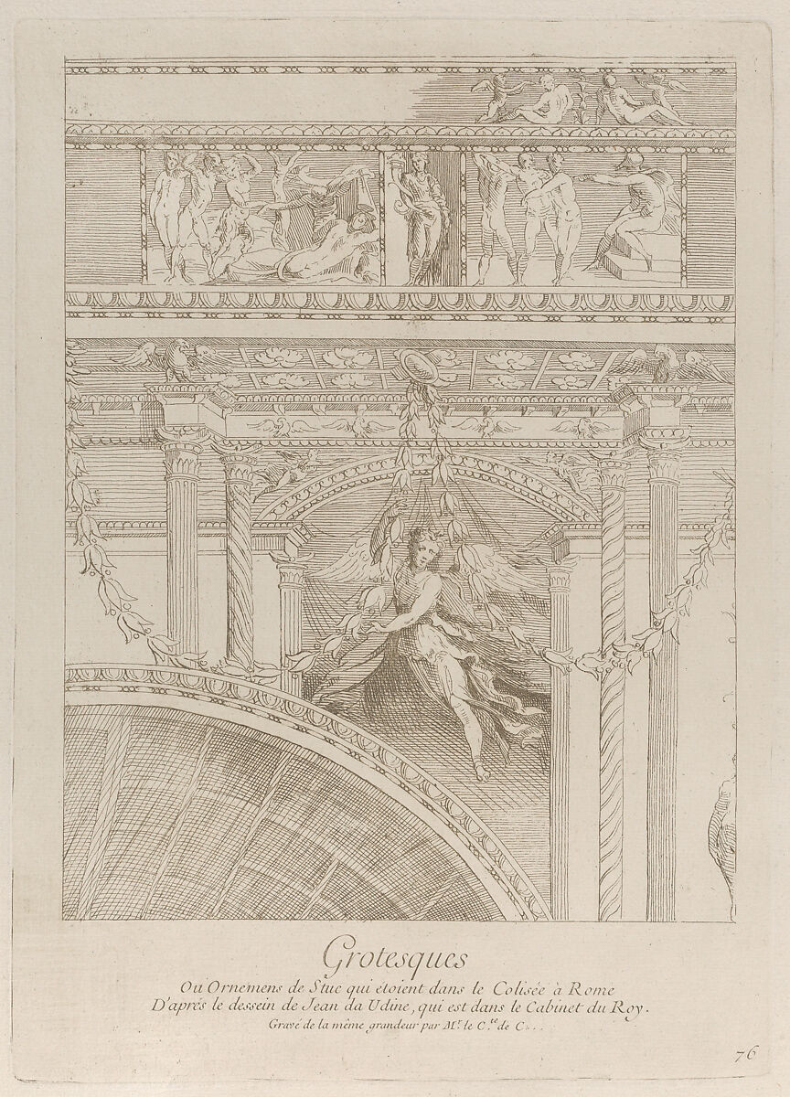 - Title: Grotesques: detail of the stucco reliefs decorating the Colosseum in Rome, with a winged figure hovering between two pairs of columns