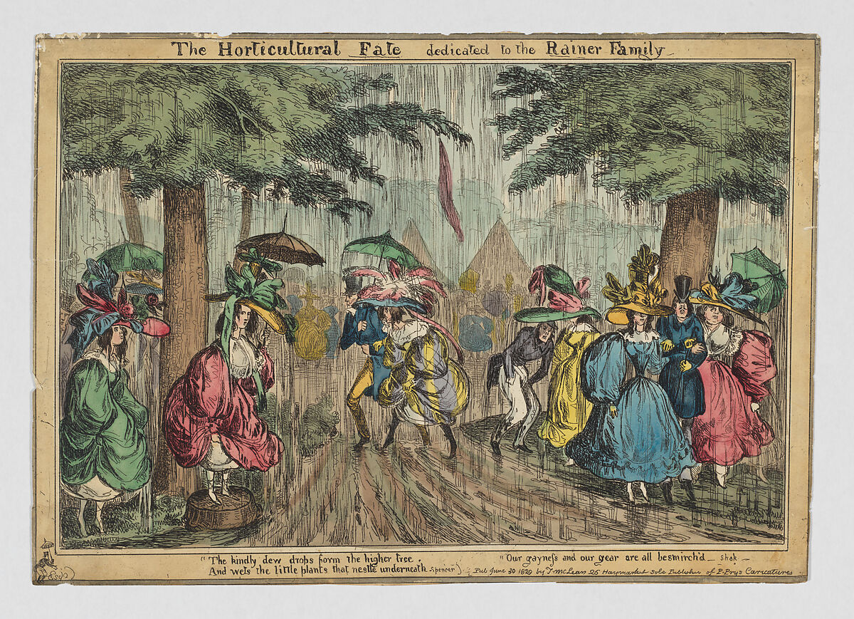 Heath here satirizes London society and current fahion in an image that responds to the Fête of the London Horticultural Society held on 27 June, 1829, at the Society's gardens at Chiswick. It was a fashionable affair with lady patrons headed by Princess Esterhazy but, unfortunately, experienced very bad weather. Fashionably dressed men and women are shown huddling under large trees or walking tiptoe through rivers of mud. Torrential rain descends vertically and water streams from the ladies's wide-brimmed hats while, the few tents in the background are woefully inadequate to shelter the crowd. Like many prints from this period, Heath signed it with a small top-hatted dandy holding an umbrella–Paul Pry, a nosy character from a play.