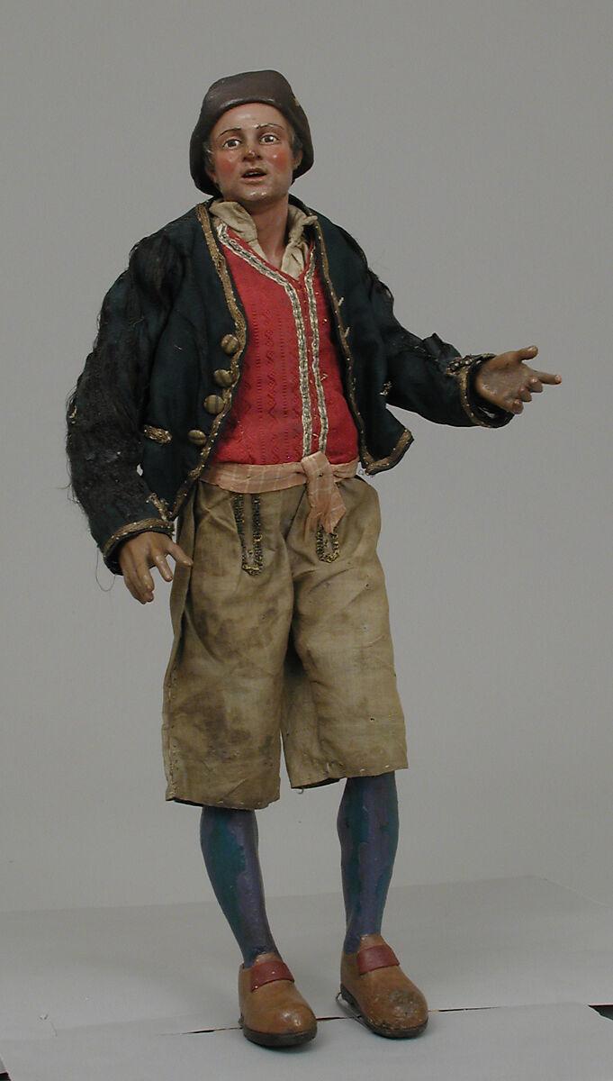 In 1964, Loretta Hines Howard generously presented to the Museum over 140 Neapolitan crèche figures, dating from the second half of the eighteenth century. The varied assortment includes figures from the three traditional scenes of a complete Neapolitan presepio: the Nativity, with angels, shepherds, and sheep; the procession of the three Magi, with their colorful retinue of attendants; and the varied and gay crowd of country and town people thronging the tavern, or inn, of Bethlehem — the diversorium mentioned by St. Luke, where on the Holy Night there was no place for Mary and Joseph. Averaging between twelve and fifteen inches in height, according to the position they were to take in perspective in the stage set, the figures are pliable and can be given poses at will, according to their facial expressions. Their bodies are made of tow and wire, their arms and legs are finely carved of wood, and their heads and shoulders are modeled of terracotta and accurately finished. Their attire, often enriched by accessories, jewels, and embroideries, is a sheer joy for the lover of folklore and eighteenth-century costumes.