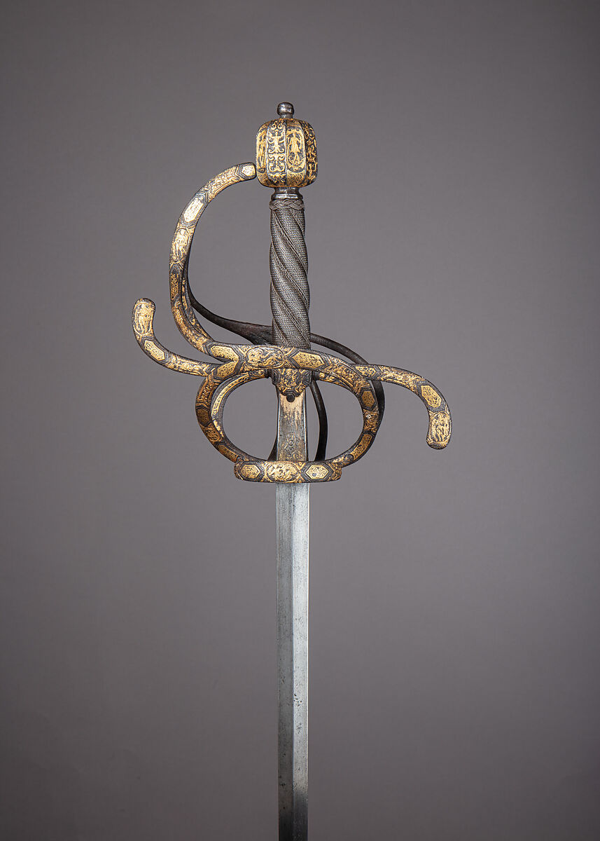 The rapier was the principal civilian sidearm throughout the sixteenth and seventeenth centuries. Designed for cut-and-thrust fencing of progressively complex techniques, the rapier is characterized by a double-edged blade with an acute point and an elaborate guard for the hand. The guards, usually of iron or steel, were subject to a variety of embellishment. They were engraved, chiseled, gilded, damascened, and encrusted in gold and silver in keeping with fashionable styles.