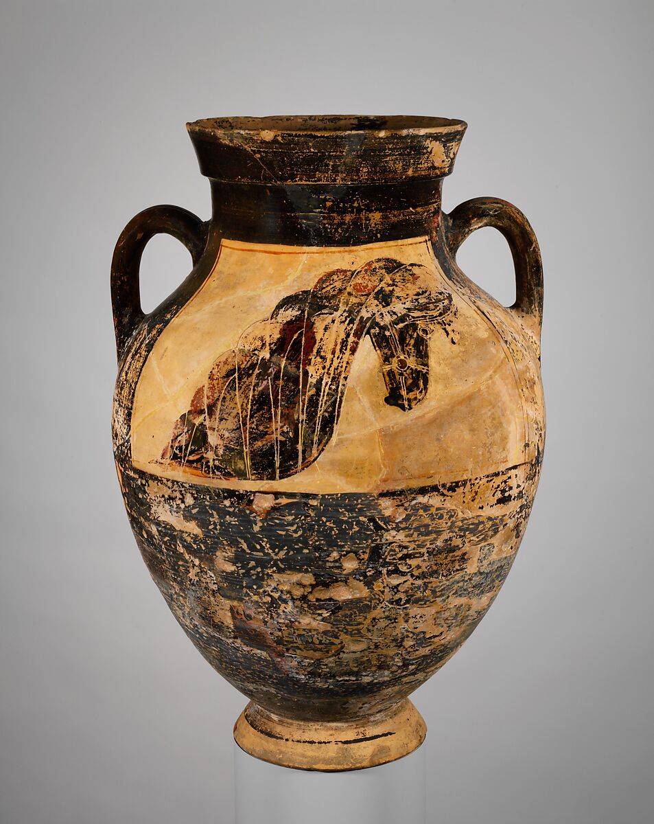 The so-called Horse-Head amphorae were produced during the first half of the sixth century B.C., especially the early part. With few exceptions, the subject of the front and back is a horse's head and neck. While the precise significance is unclear, the reference is clearly to the horse as a symbol of status and wealth. The vases vary in size and were widely exported in antiquity, to Italy, the eastern Mediterranean, and Egypt. Their function would have varied as well. Because of its size and the signs of wear, this example may have stood on a grave.